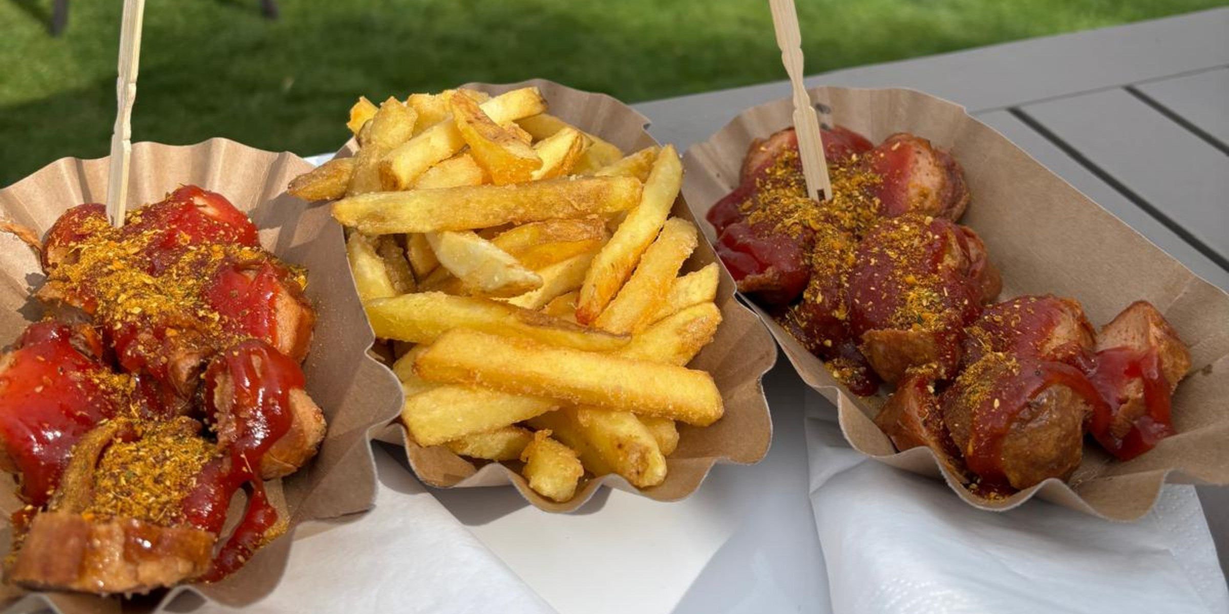 Auf die Hand gibt es ehrliche Klassiker: knusprige Pommes, Currywurst, Bratwurst und viele weitere Köstlichkeiten – genau richtig zur Stärkung für zwischendurch. Dazu reicht die Getränkekarte von kühlen Softdrinks über Bier und Wein bis hin zum Aperol in der Abendsonne.